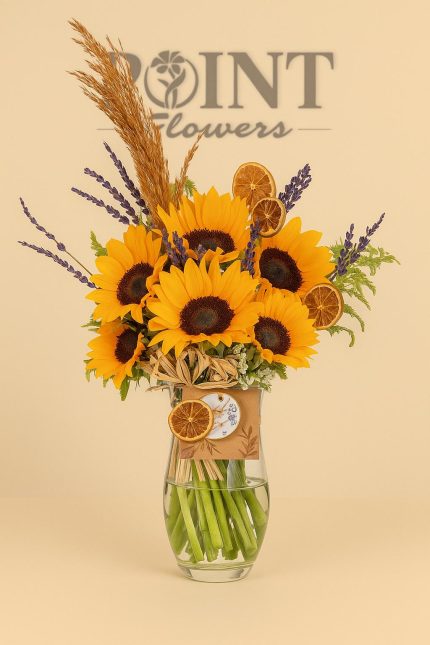 Cam vazo içerisinde 6 adet ay çiçeği ve aksesuarlar kullanılmıştır.