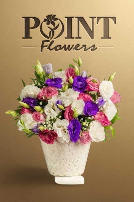 Porselen orkide saksısı içerisinde lisyantuslar ile hazırlanmıştır.