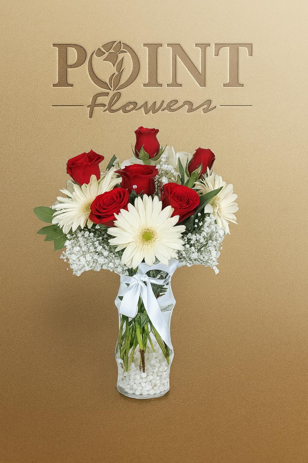 Cam vazoda beyaz gerberalar ile  6 adet kırmızı gül kullanılarak  kullanılmıştır.