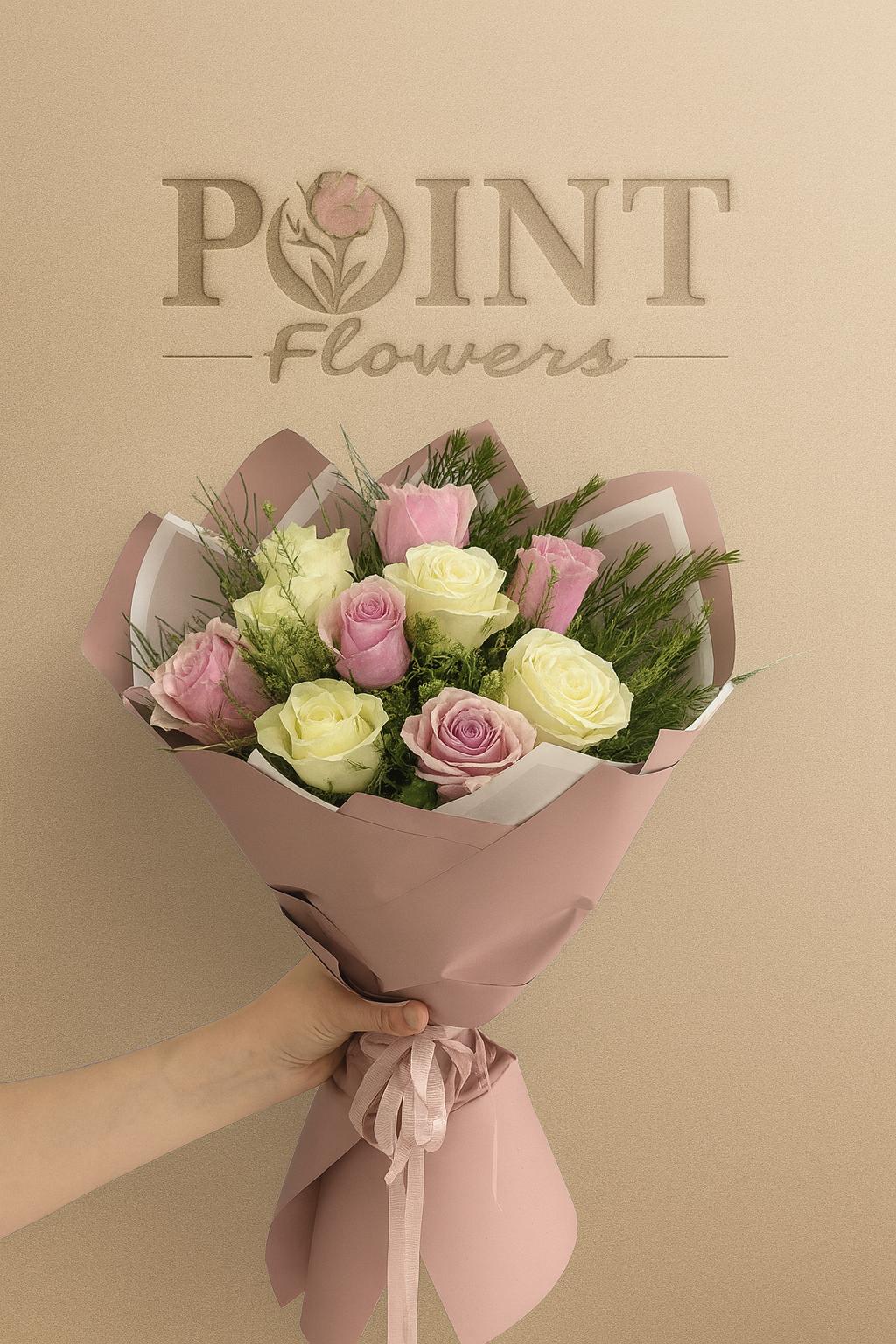 Ana Sayfa Çiçek Sunumları Buketler Beyaz ve Pembe Renkli İthal Güller 10 Dal BKT0056
