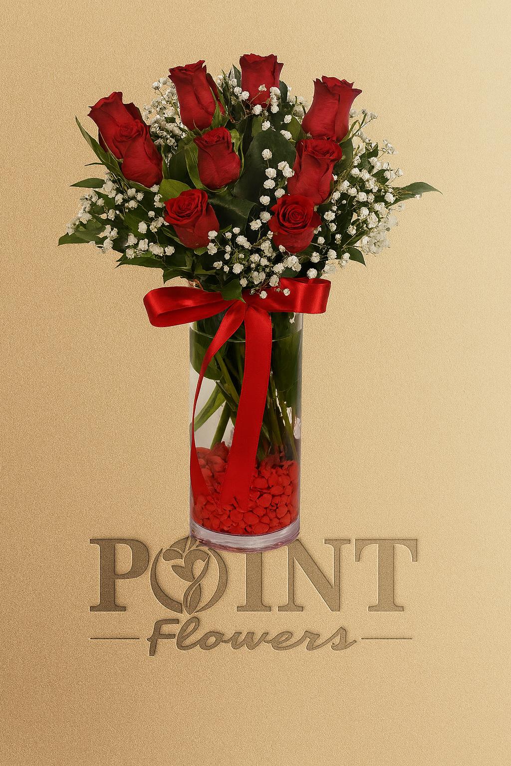 Cam Vazoda Silindir cam vazoda 9 adet kırmızı gül kullanılmıştır.