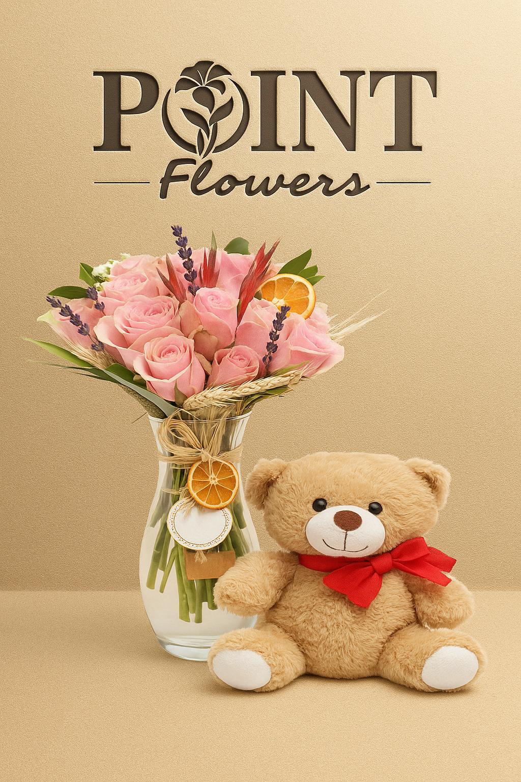 Cam vazo içerisinde 13 adet pembe gül ve aksesuarlar kullanılmıştır yanında peluş ayıcık bulunmaktadır.