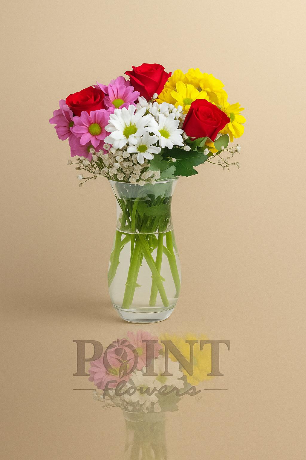 Silindir cam vazoda sarı-pembe-beyaz papatyalar içerisinde 3 adet kırmızı gül kullanılmıştır.